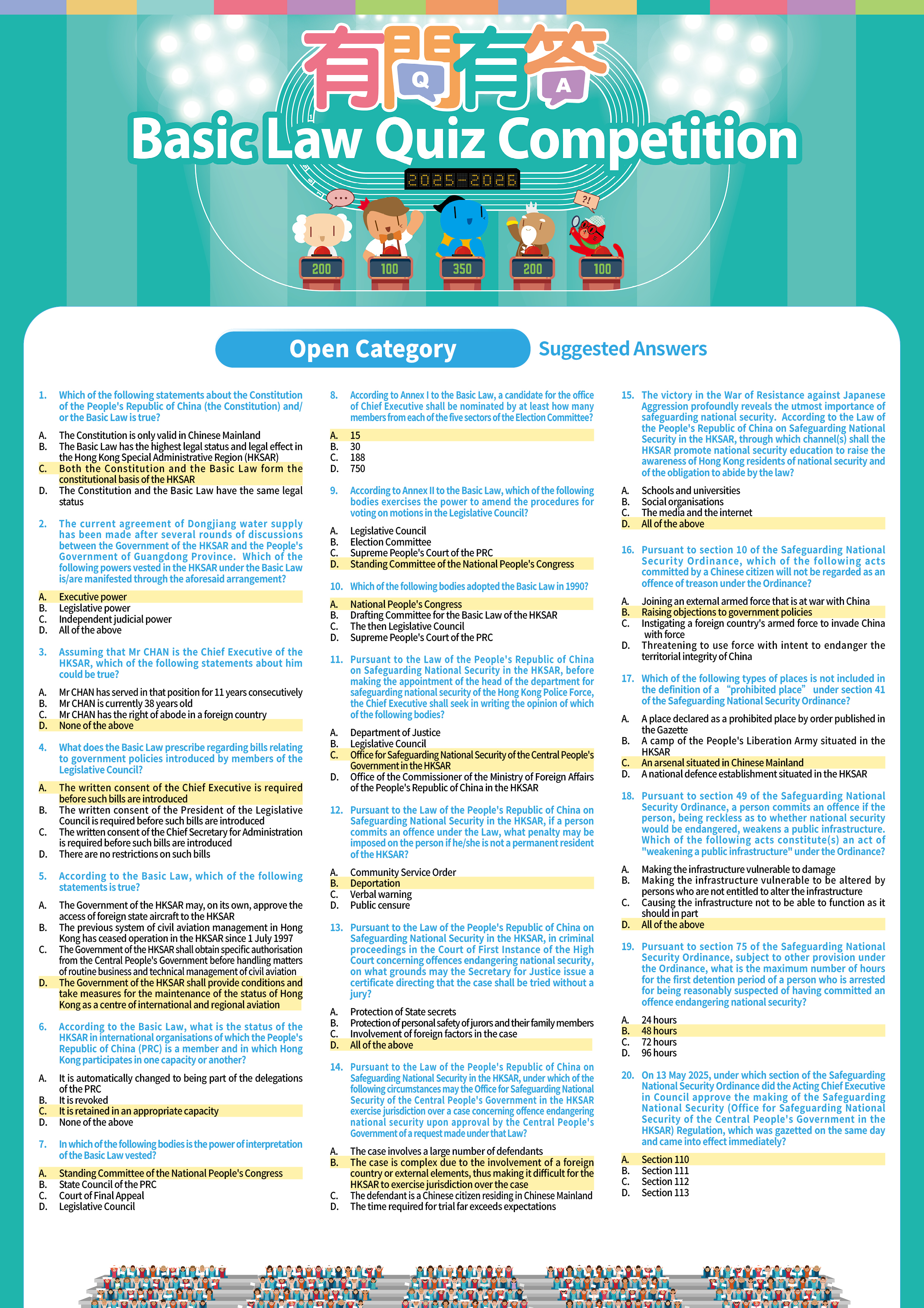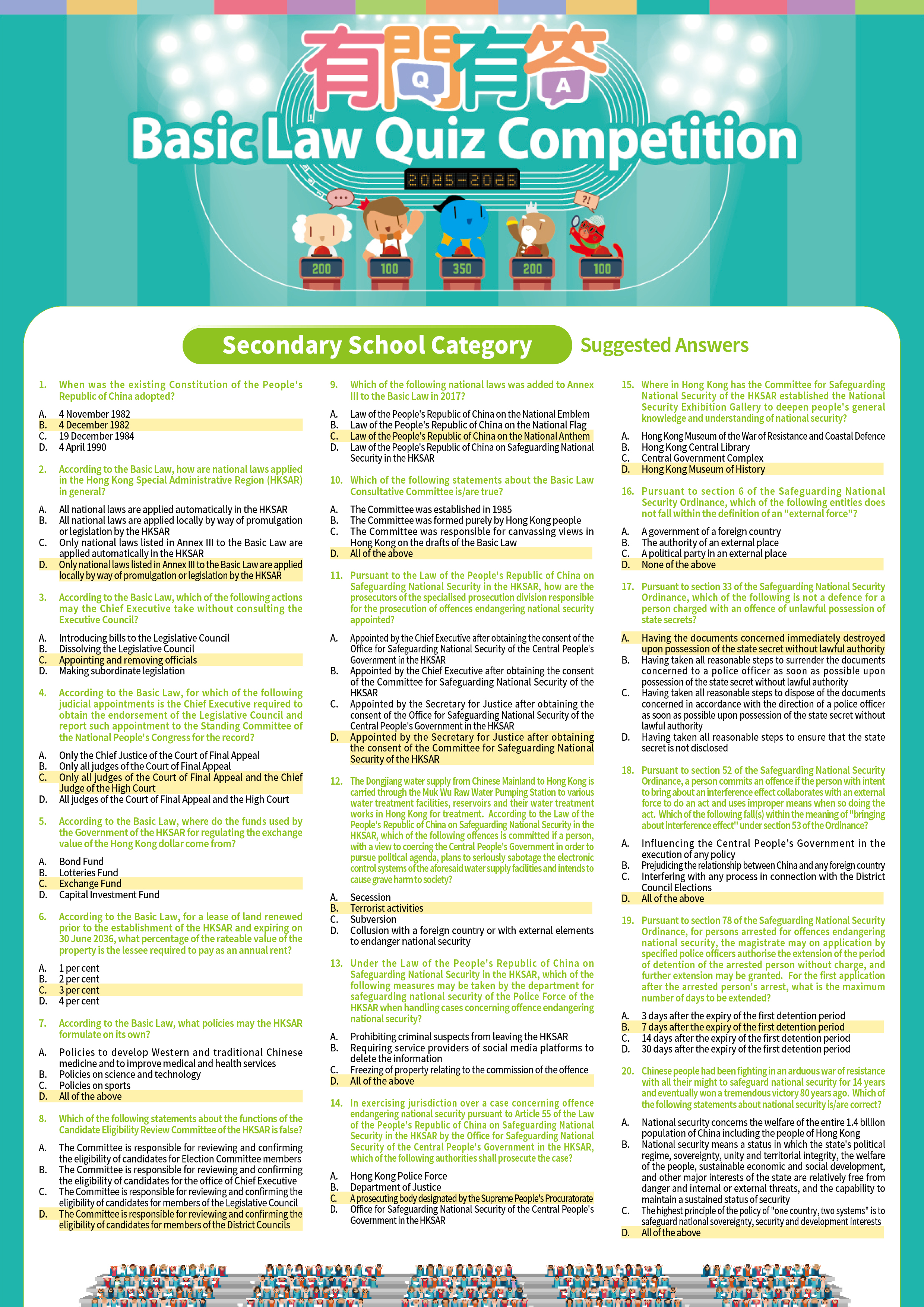 Application for the entry round of the Basic Law Quiz Competition 2025-26 has been closed. You may click the below links to download the answers of the entry round questions (highlighted in yellow) for reference. Those with the best performance in each category will be selected by ballot and will be notified individually about the details to attend the Quiz Final and Prize Presentation Ceremony. Attendees may have a chance to compete in question sessions for prizes.